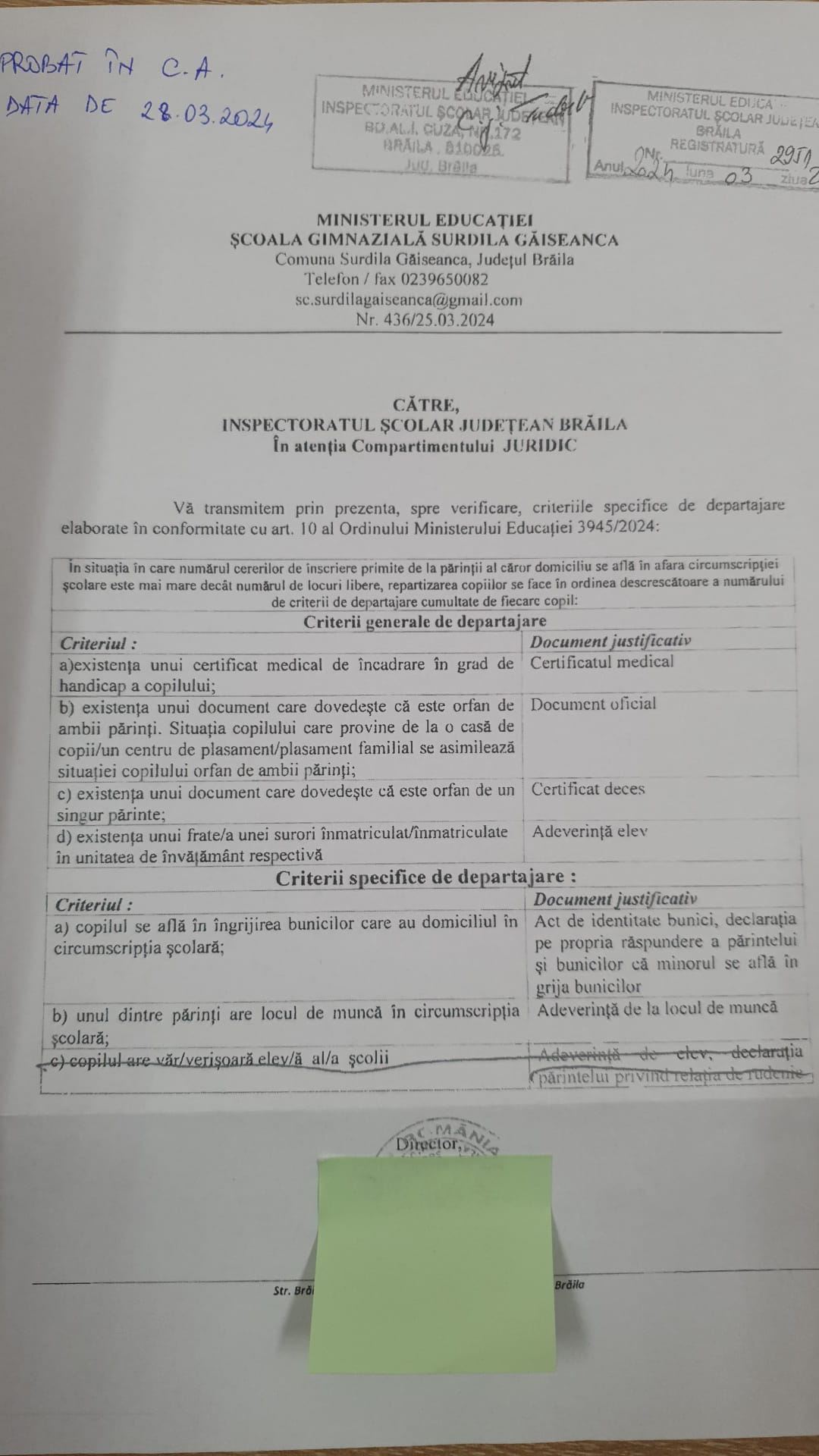 Criterii inscriere la CP, 2024-2025